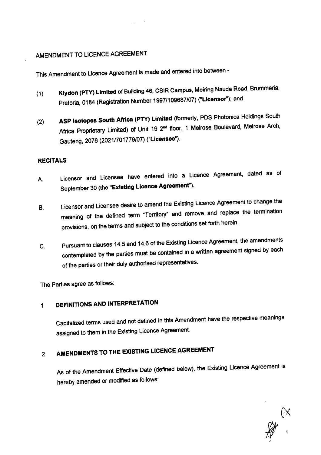 | (1) | Klydon (PTY) Limited of Building 46, CSIR Campus, Meiring Naude Road, Brummeria, Pretoria, 0184 (Registration Number 1997/109687/07) (“Licensor”); and |