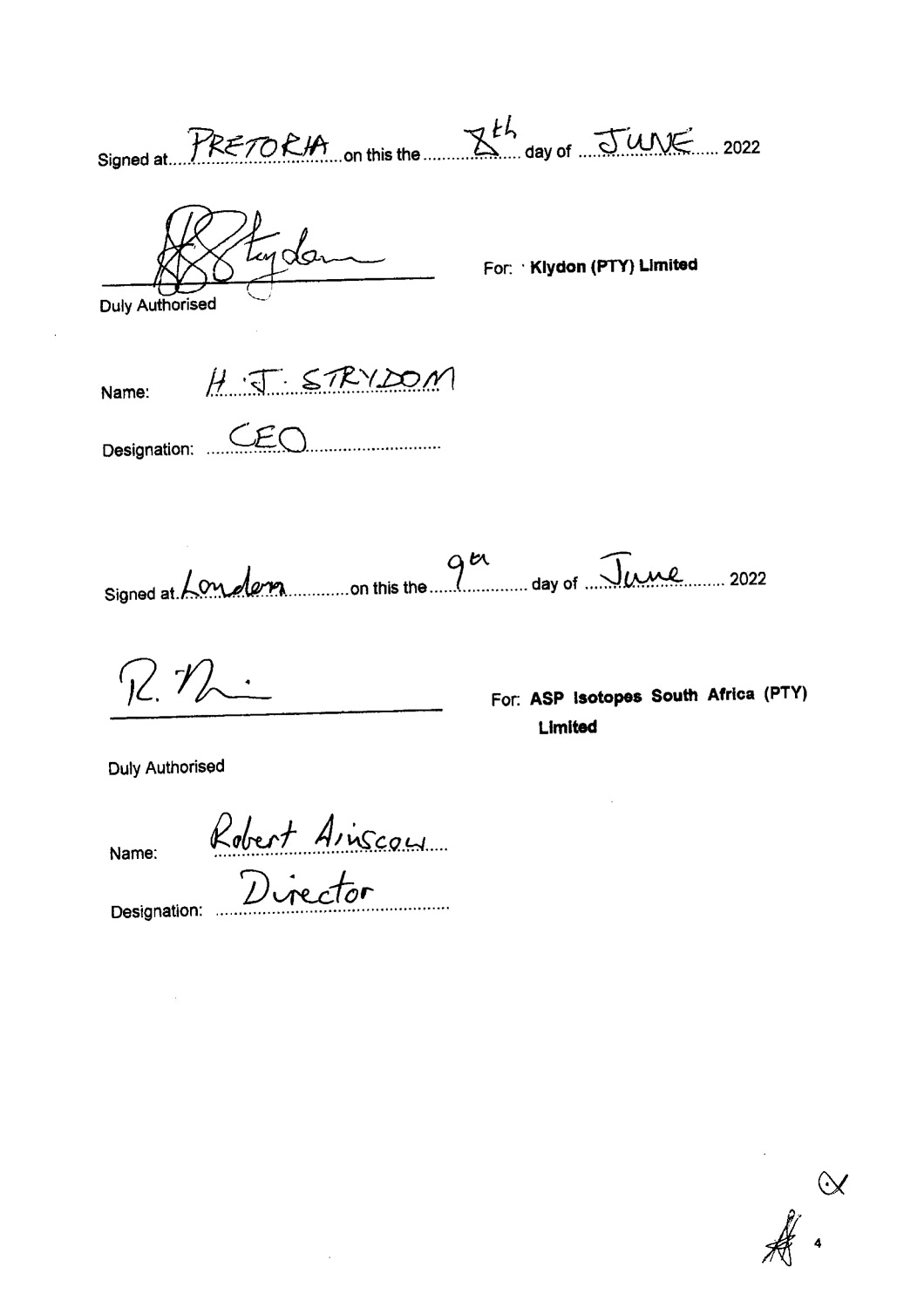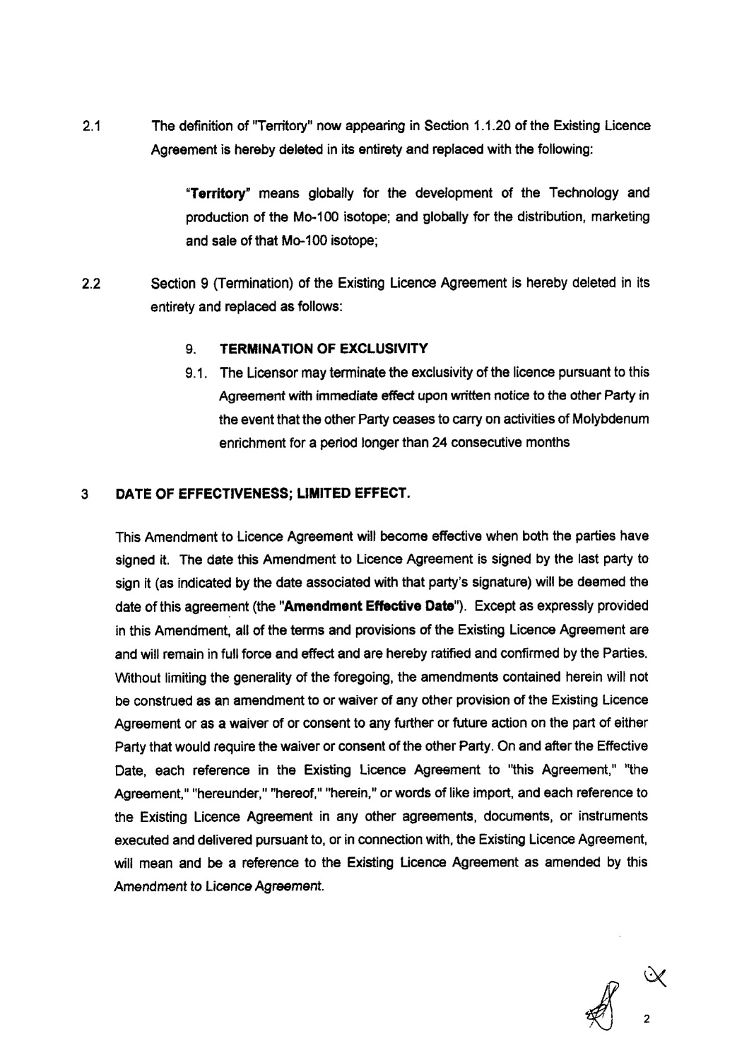 | 1.1.20 | “Territory” means South Africa for the development of the Technology and production of the Subject Isotope; and globally for the distribution, marketing and sale of the Subject Isotope; and |