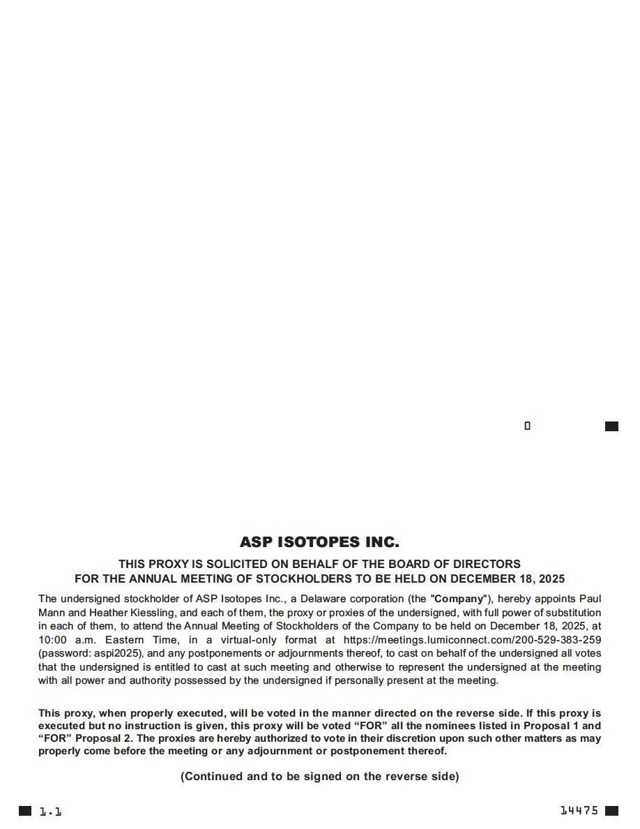 The Annual Meeting of Stockholders (the “Annual Meeting”) of ASP Isotopes Inc. (the “Company”) will be held on Thursday, December 18, 2025, at 10:00 a.m., Eastern time. The Annual Meeting will be held in a virtual format via live webcast over the Internet. You will be able to join the Annual Meeting and vote and submit your questions online during the Annual Meeting by visiting https://meetings.lumiconnect.com/200-529-383-259. We have designed the virtual Annual Meeting to ensure that stockholders are afforded the same opportunity to participate as they would have at an in-person meeting, including the right to vote and ask questions through the virtual meeting platform. Reference to “in person” attendance or voting in our proxy materials refers, therefore, to attending or voting at the Annual Meeting virtually.